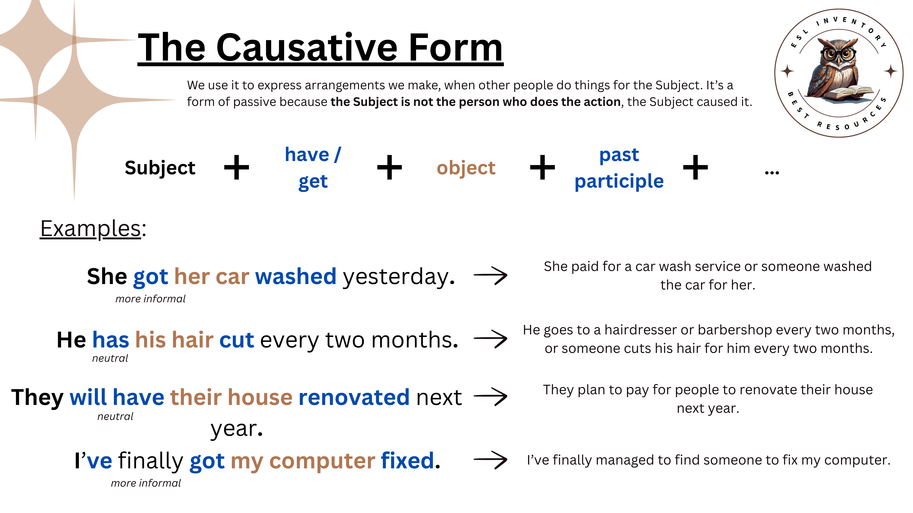 Causative verbs include have, and get. If you’d like to study Passive Voice first, click here.