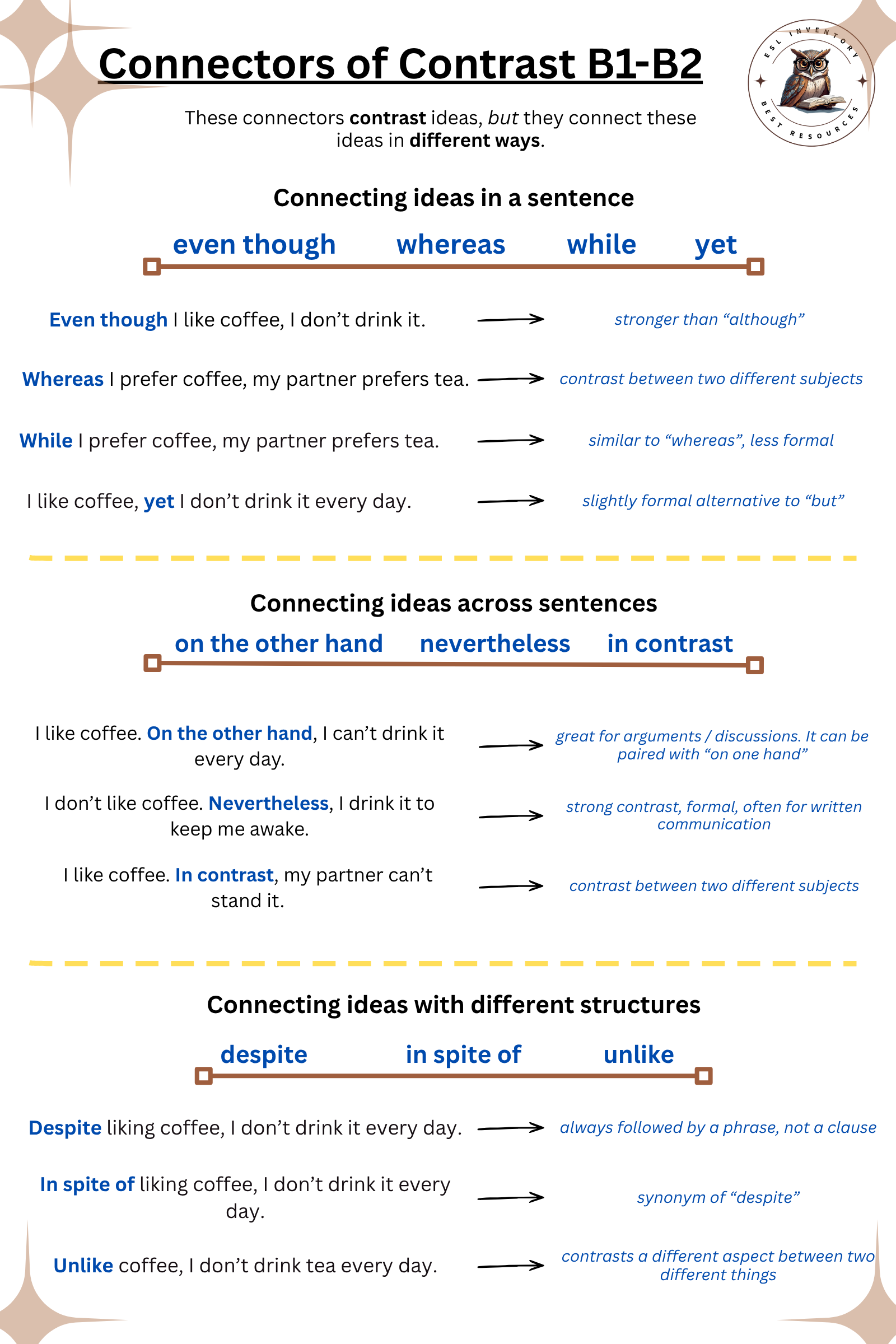 Connectors of contrast are words or phrases that links two ideas that are different or opposite. They can be: