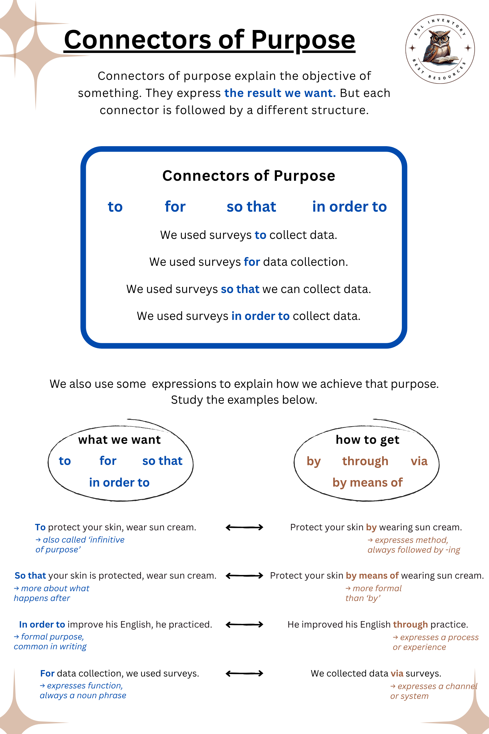 Connectors of purpose (also Connectors of Result) are words and phrases we use to explain why we do something. They show the goal or intention of an action. In this guide, you will also learn common expressions used to explain how we achieve that goal (the method).