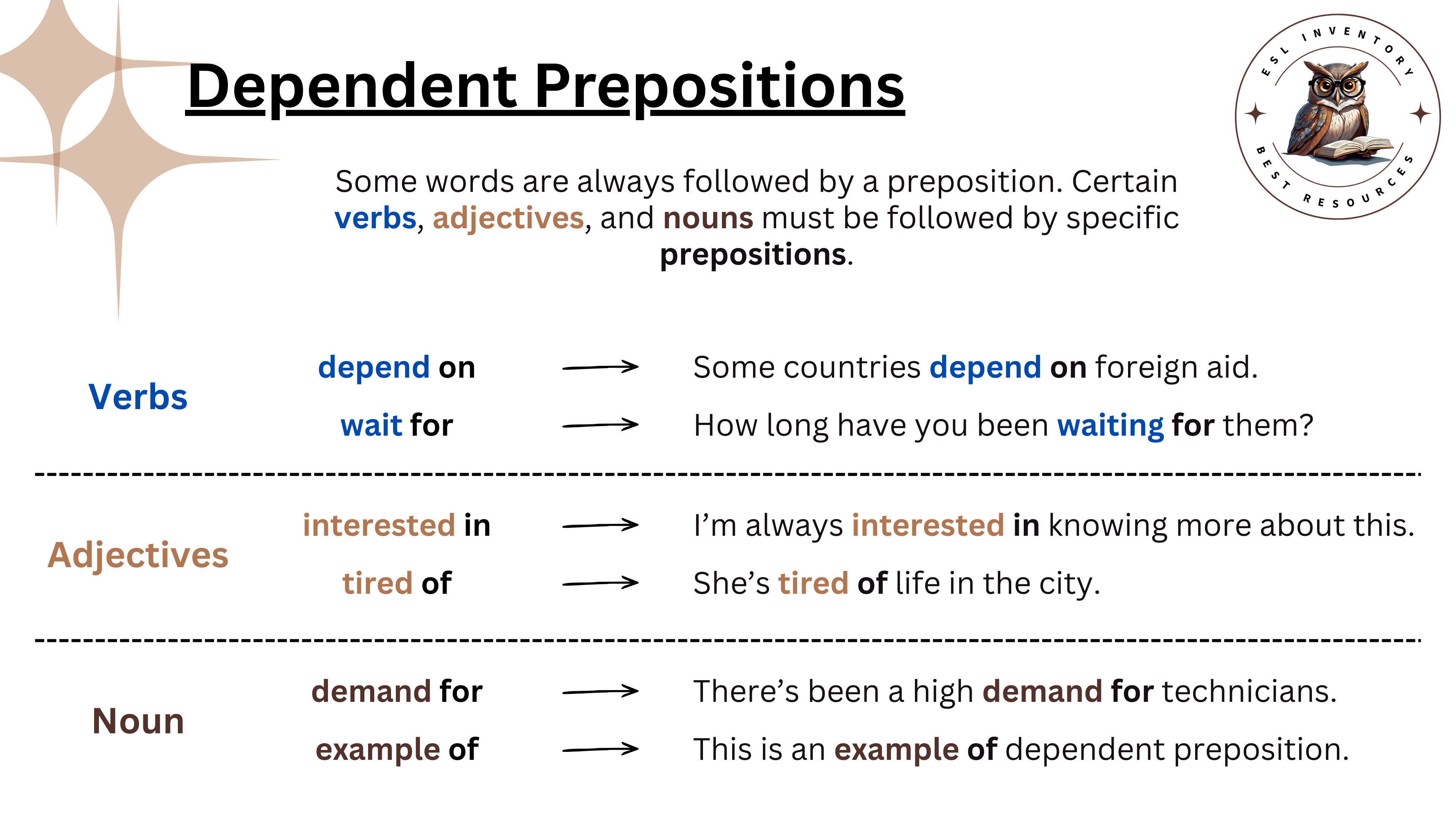 Some verbs, adjectives, and nouns are always followed by a specific preposition, and these words keep their normal meaning. These are called dependent prepositions. For example, we say “afraid of spiders”, “interested in music”, or “good at languages”. The same happens with some verbs: “wait for the bus”, “depend on the weather”, or “belong to me”.