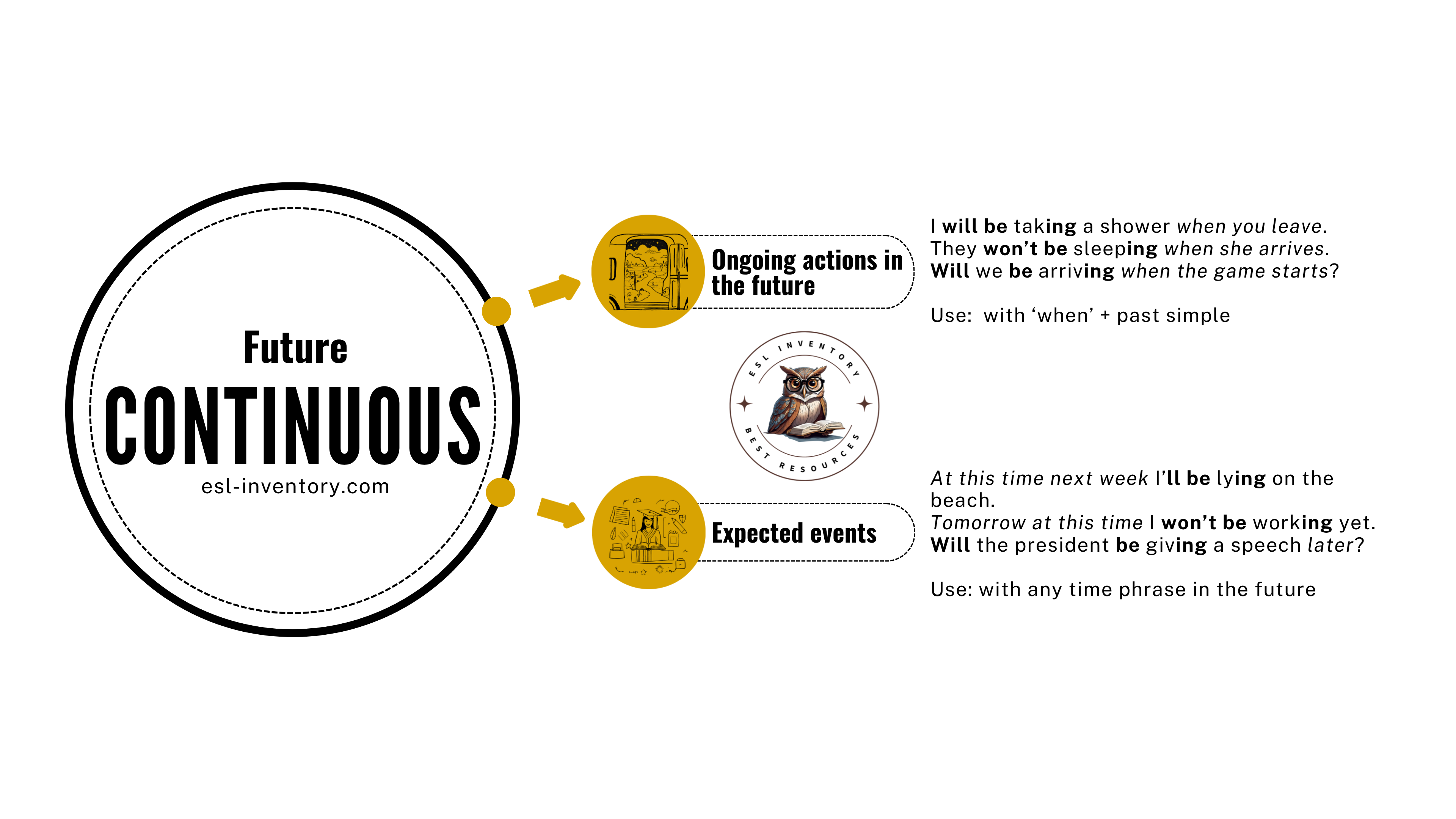 - Example: “I will be studying at 8 PM.” (The focus is on the action happening at a certain time.)