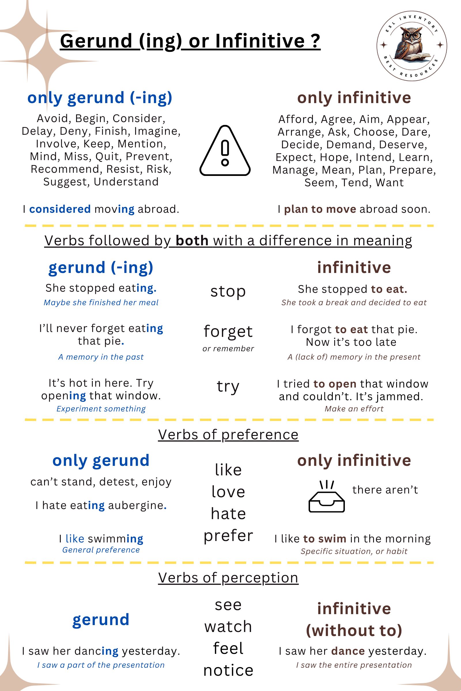 When we use verbs in English, we sometimes need to use them in special forms: the gerund (verb + -ing) or the infinitive (to + verb). Here they are no longer seen as conjugated verbs, but as nouns, objects and complements. Both forms are important, but we use them in different ways. Below, you see cases in which gerund or infinitive can be used with slight difference in meaning.