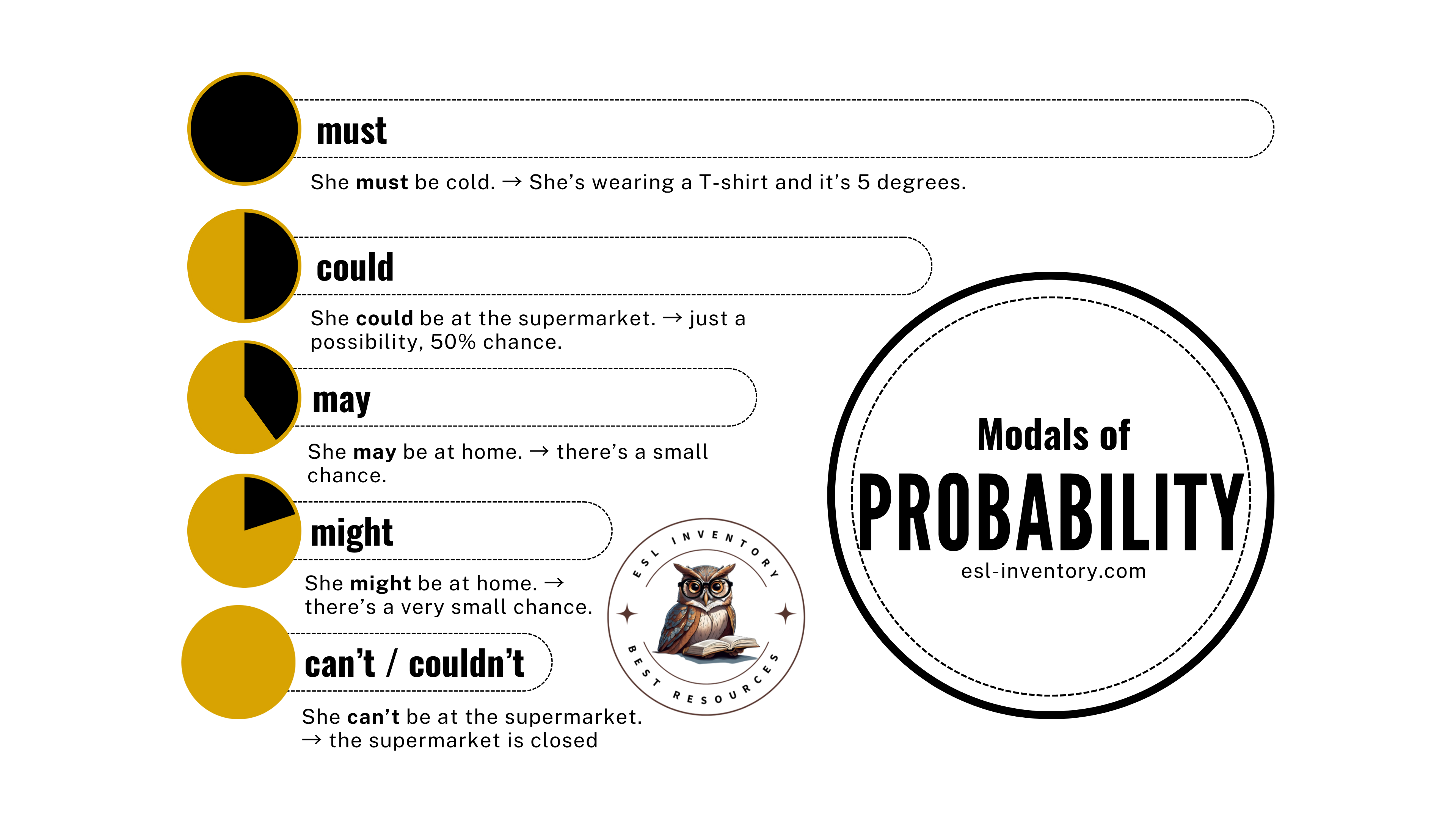 We use these modals to guess, infer, or speculate about a situation. These are called modals of Deduction, Modals of Speculation or Modals of Probability. We choose different modals depending on how certain we are, and whether we’re talking about the present, past, or future.