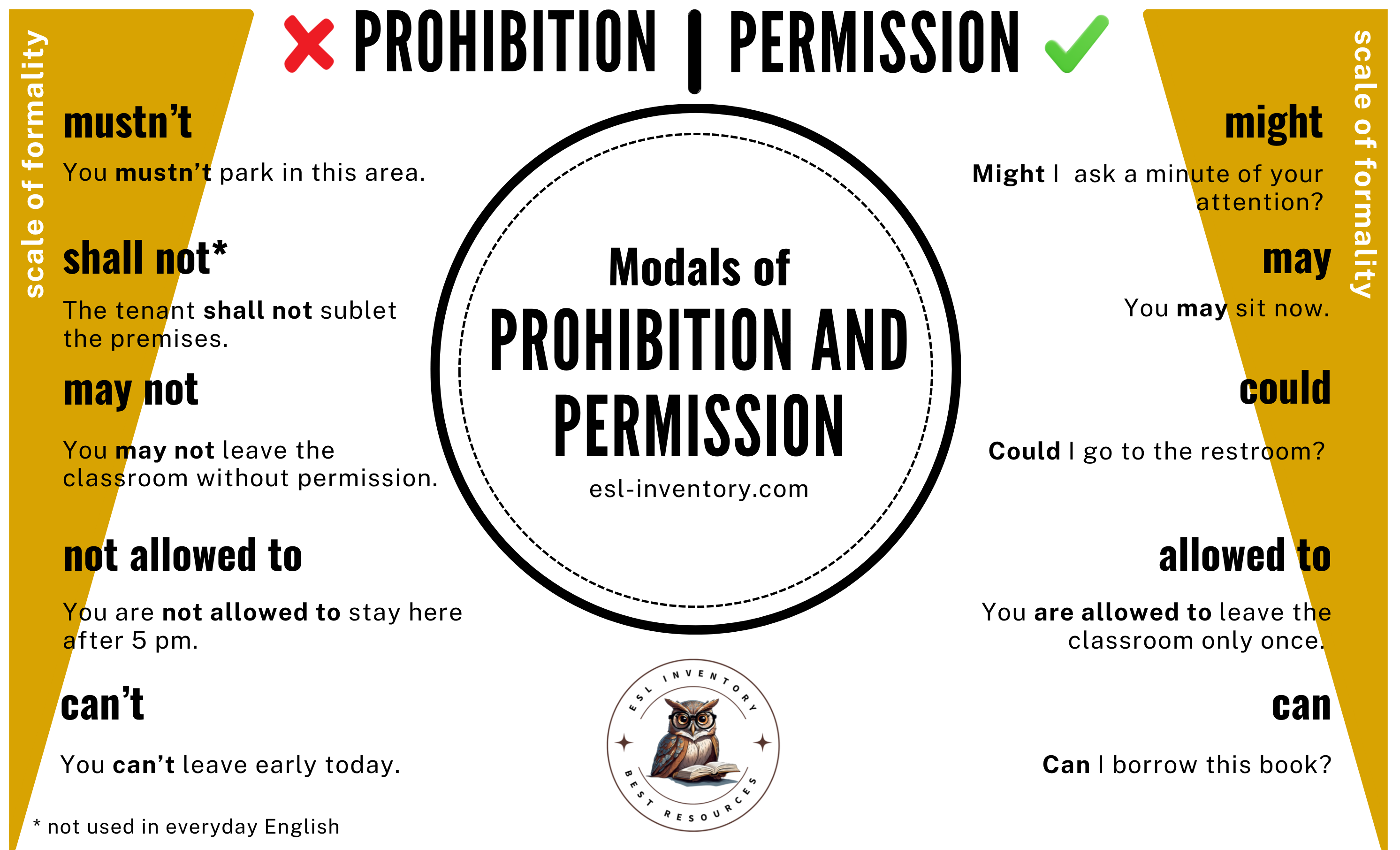 Modals of prohibition and permission are used to ask for or give permission and to indicate that something is not allowed. Study the article below, there are exercises at the bottom of the page.