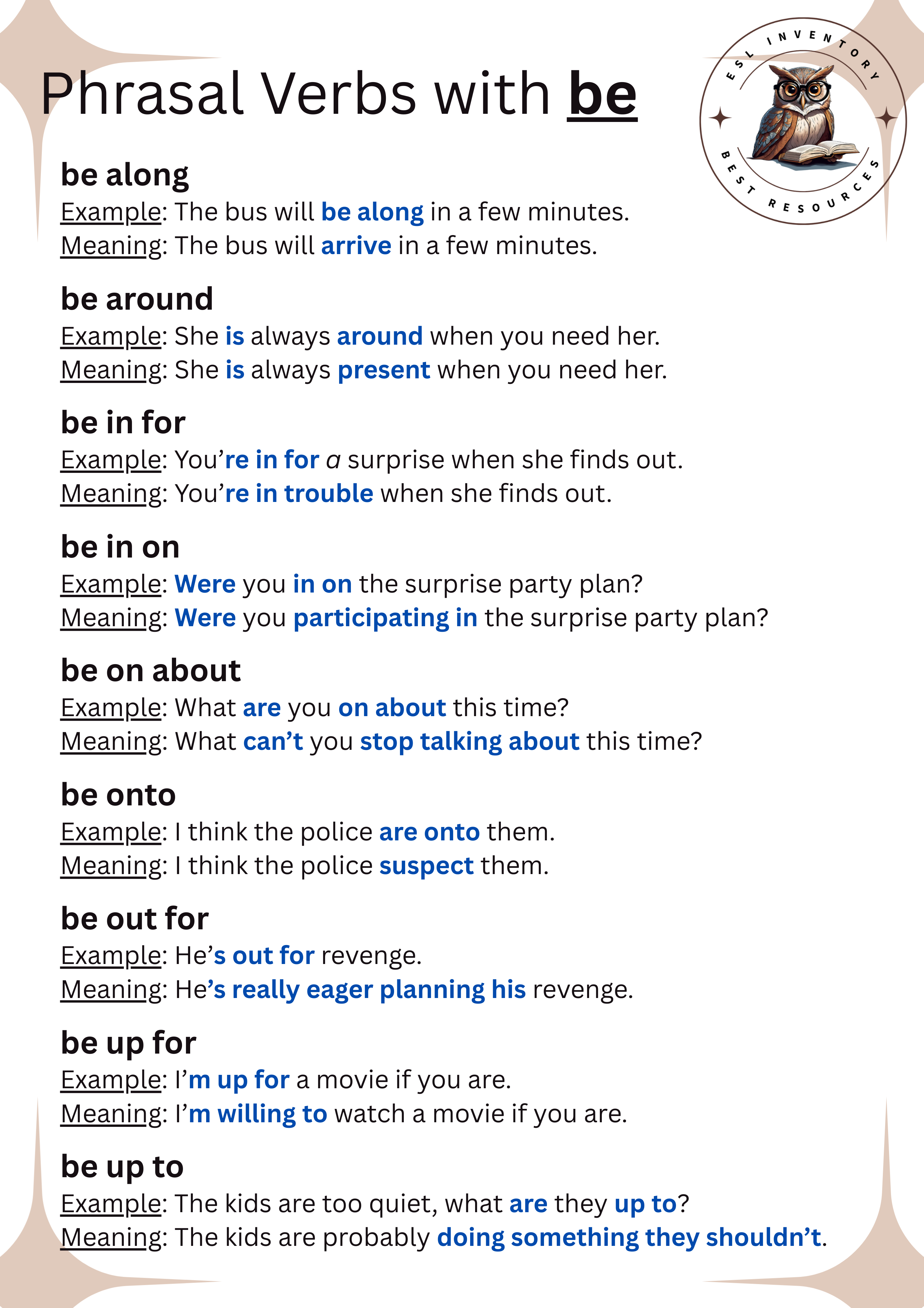 There are many phrasal verbs with be, and also many expressions. In this page we’ll see the phrasal verbs only. Study the list below and do the exercises at the bottom of this page.