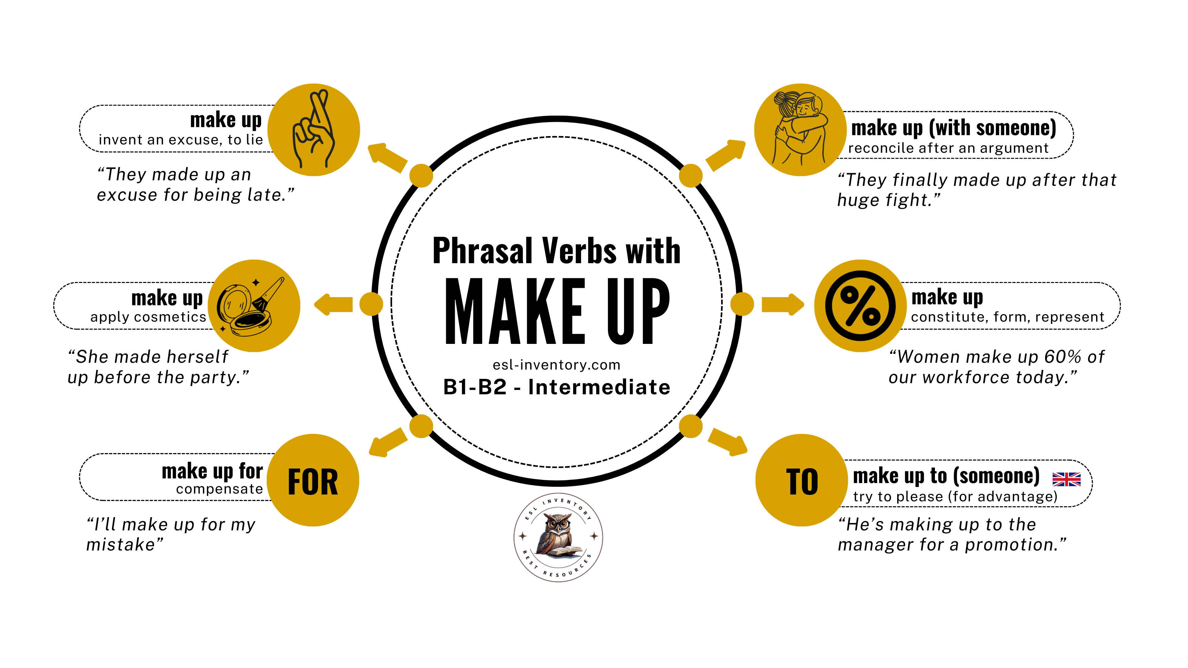 Phrasal Verbs with Make might be more challenging than others, especially “make up” since it has multiple meanings. You can study them separately as suggested below, and also find a comprehensive list and the exercises at the bottom of the page.