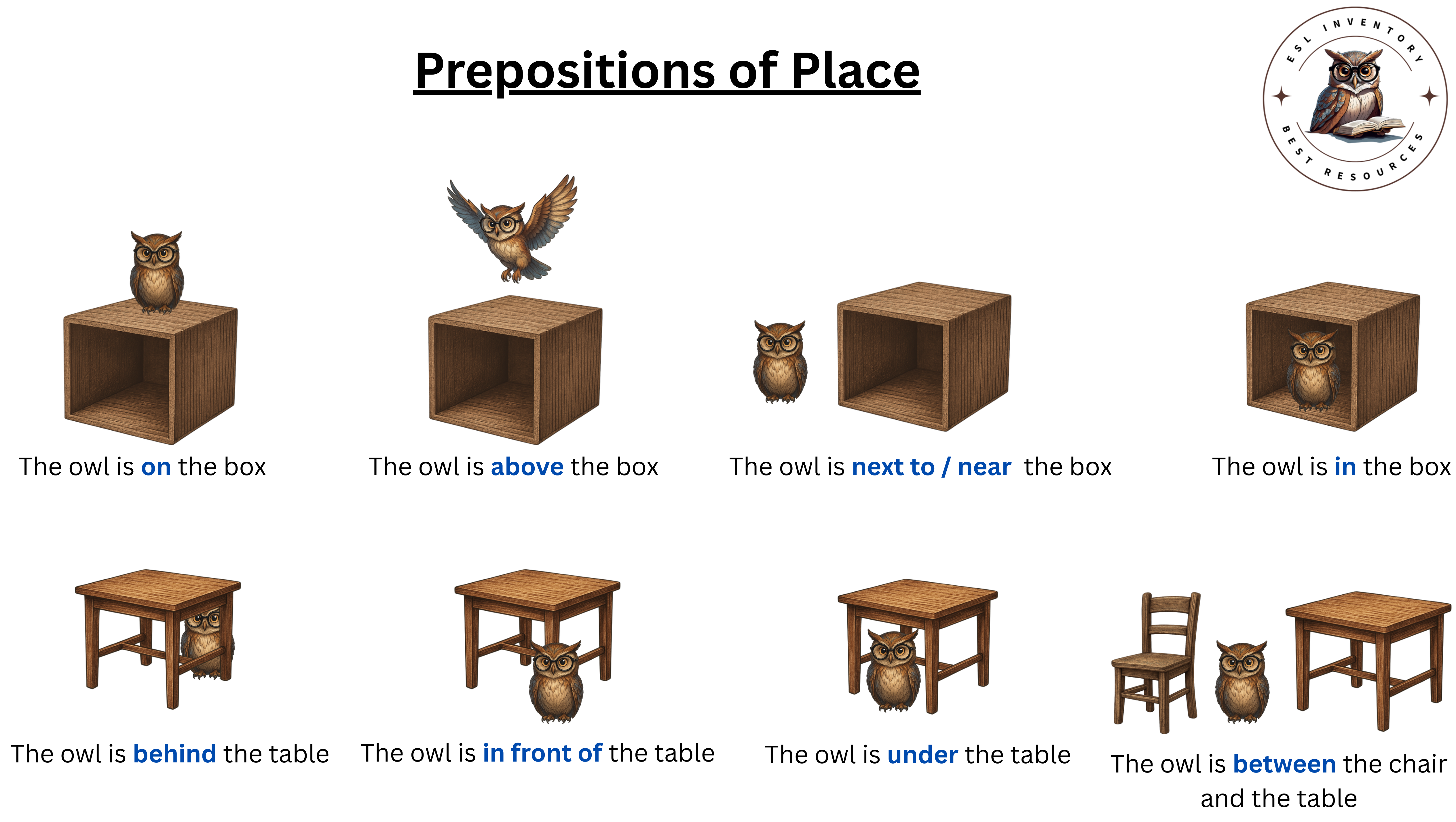Prepositions of place tell us where something or someone is. They describe a static position and answer the question “Where?” For example, “The cat is under the table,” or “The book is on the desk.”