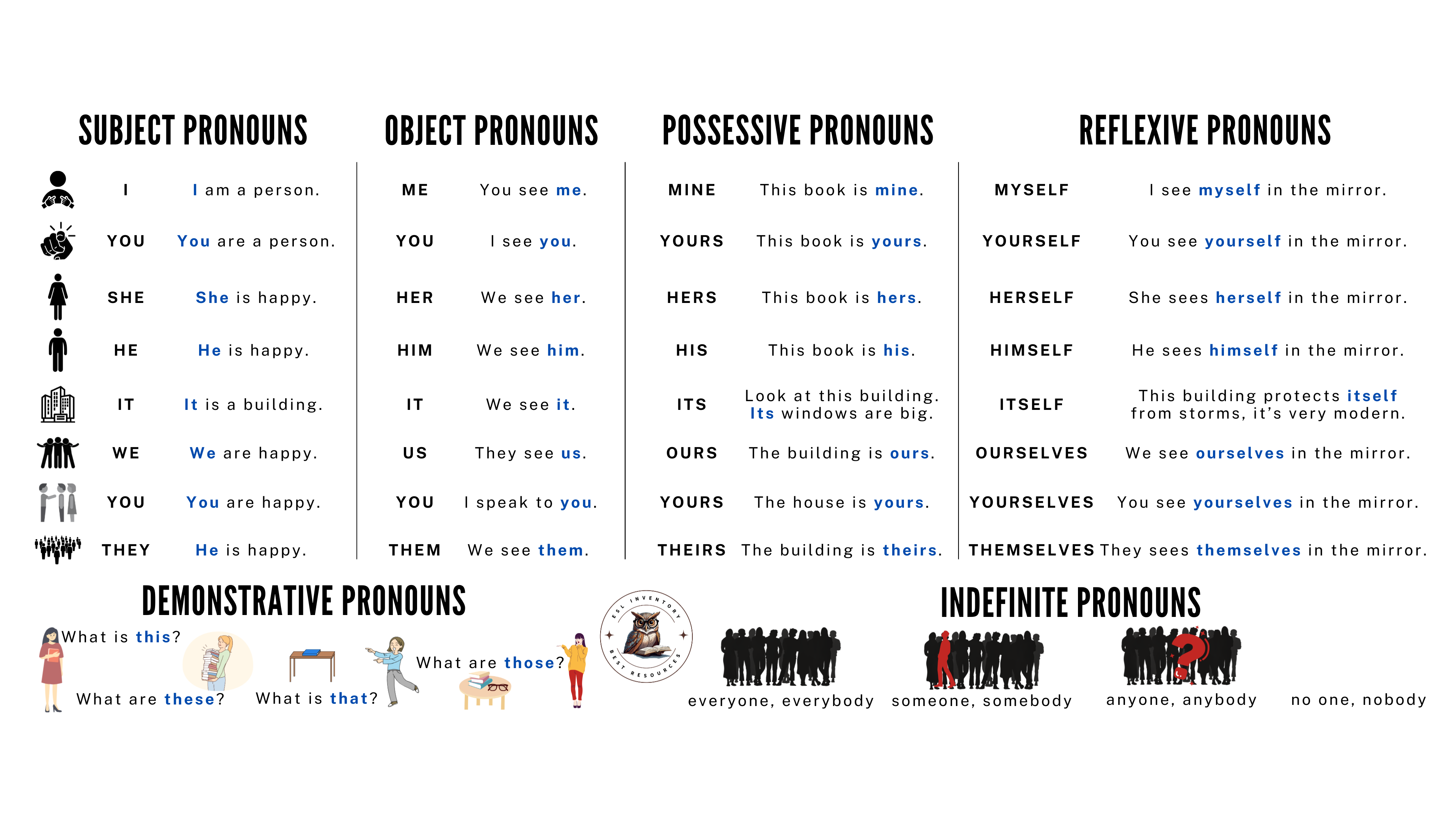 | Subjects | Objects | Possessives | Reflexives |