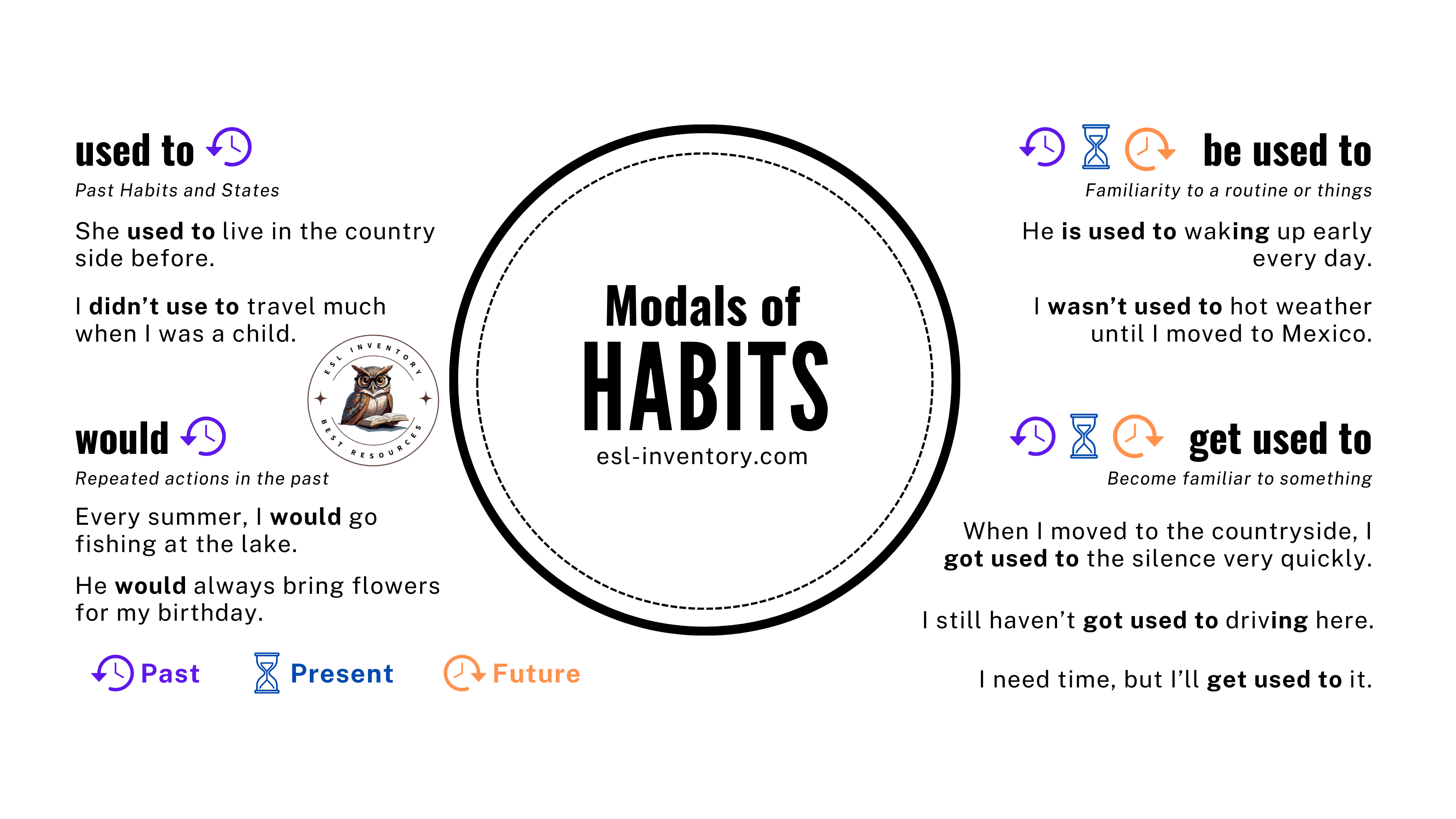 Infographic: used to, be used to, get used to and would