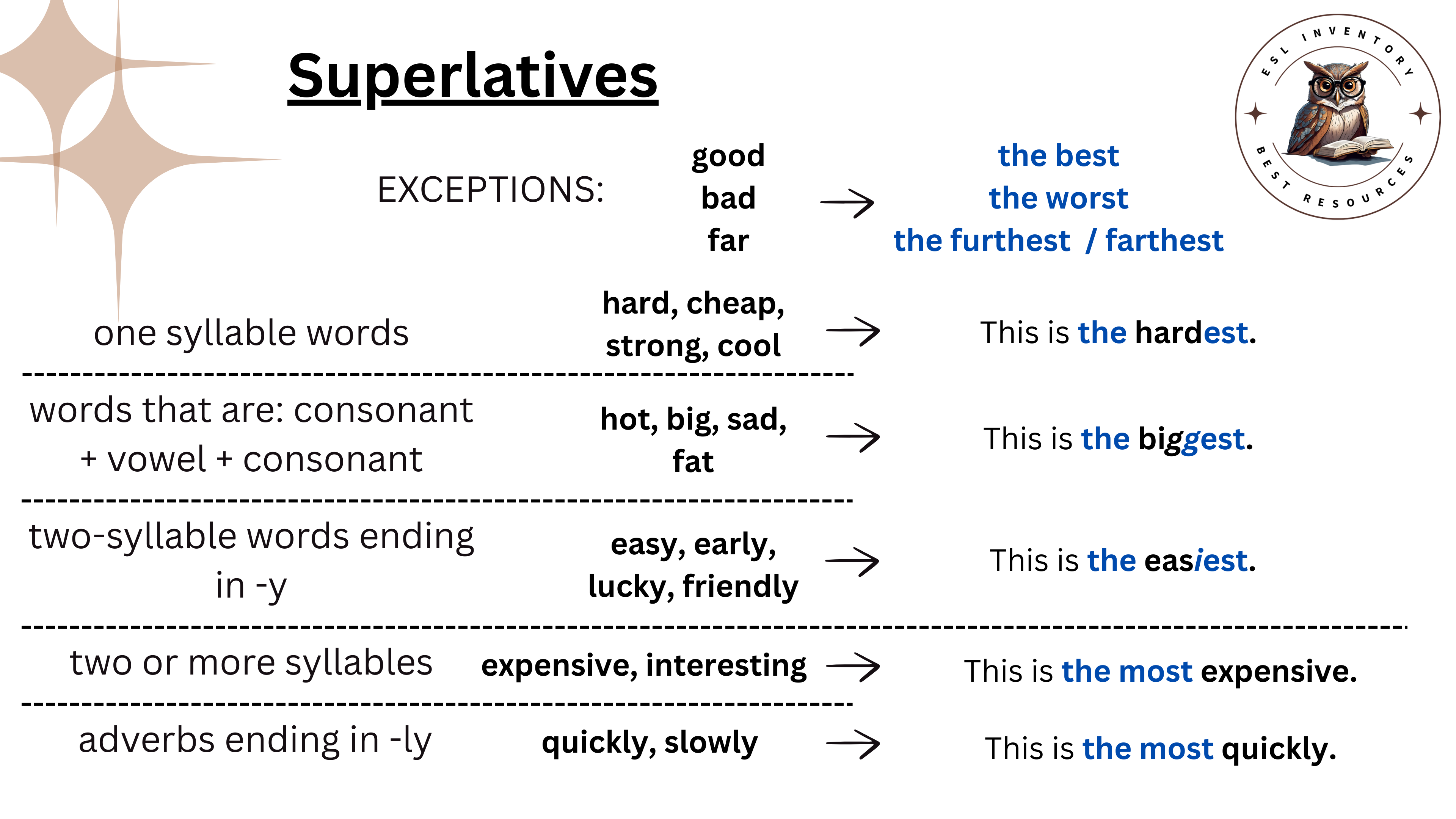 | Irregular adjectives | Change word completely | good → the best bad → the worst far → the farthest/furthest |