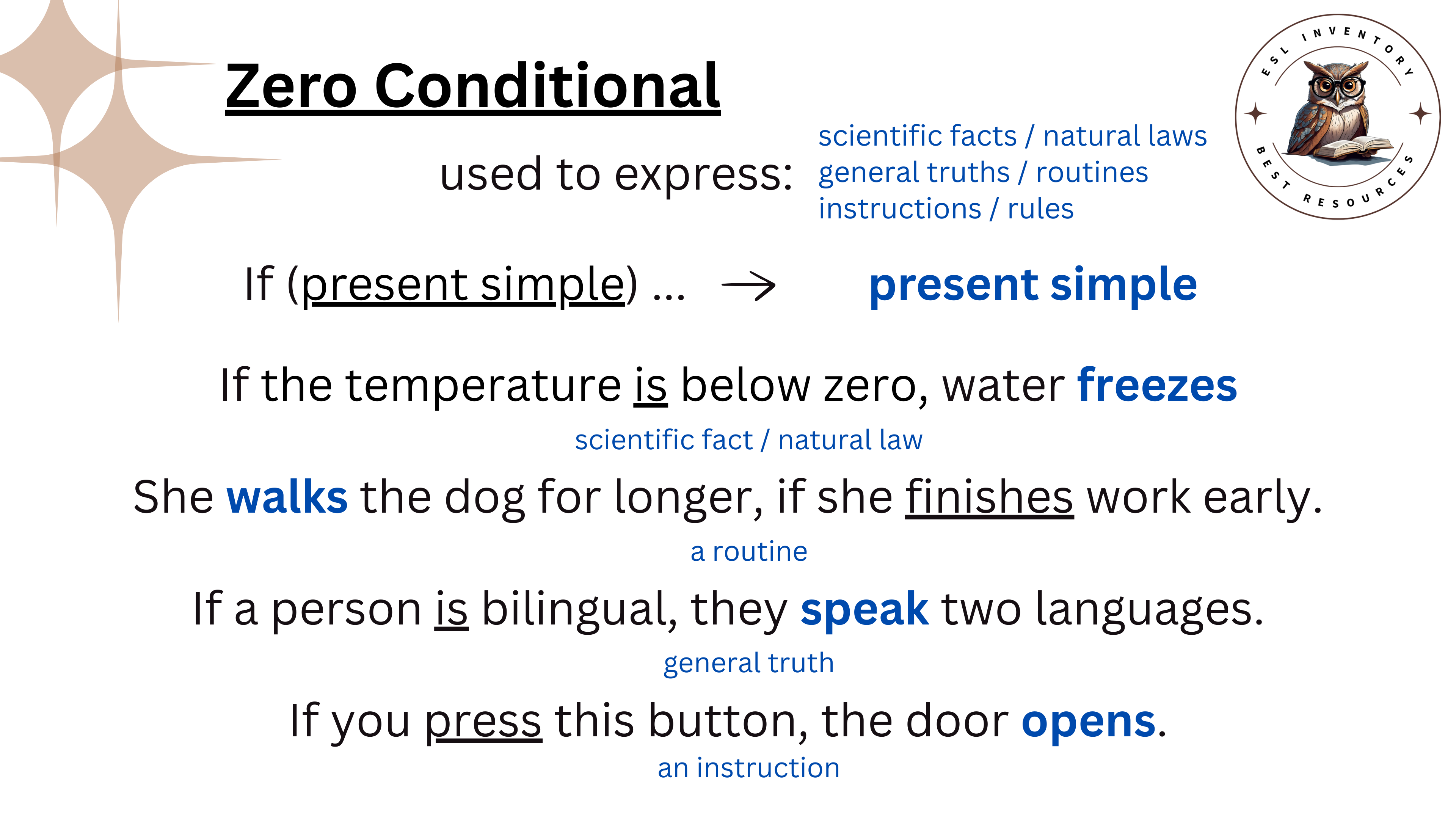We use the Zero Conditional to talk about things that are always true. That is: facts, rules, and situations where one action always follows another. Try this exercise: